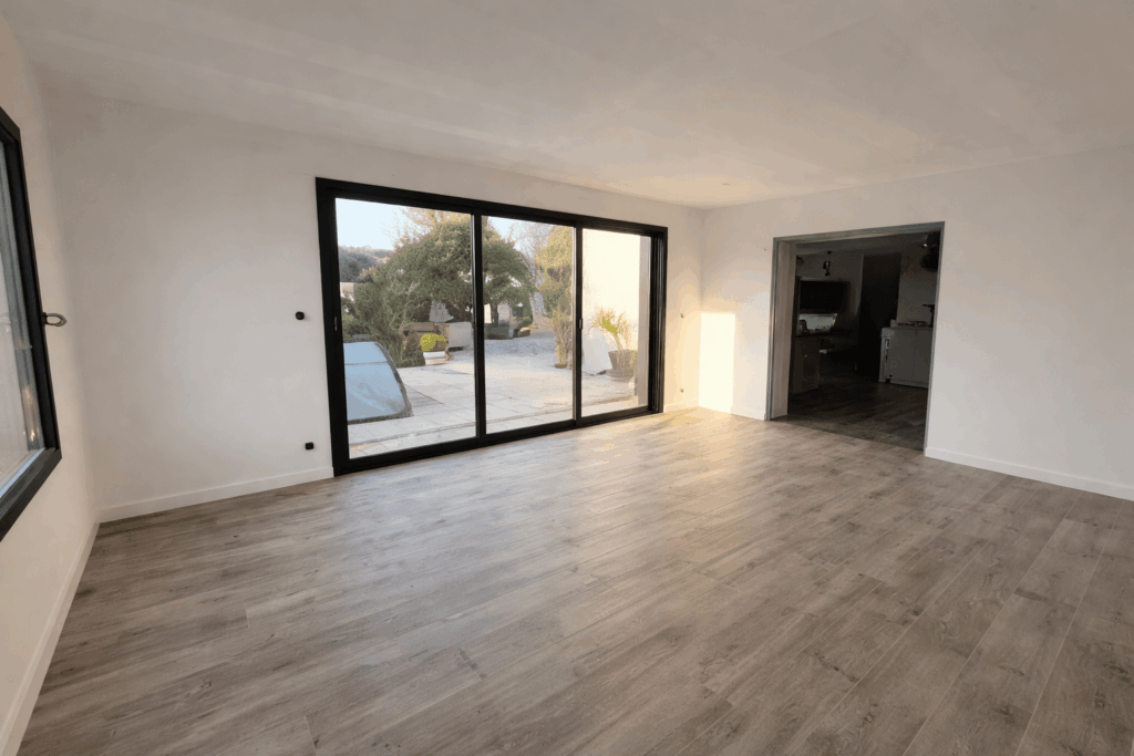 Ouverture d’un mur porteur et pose d’une grande baie vitrée pour un séjour plus lumineux, mieux relié à la terrasse,