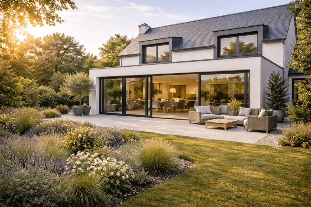 Extension à Saint‑Avé : salon convivial ouvert sur le jardin, lumière optimisée et pierre préservée, piloté par Horizon Extension (Morbihan/Nantes).