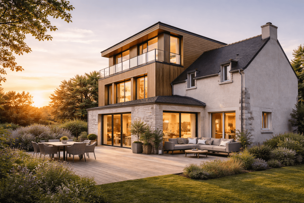 Horizon Extension transforme une bâtisse en loft lumineux : volumes ouverts, cachet préservé, combles/terrasse/carport/surélévation, Morbihan–Nantes.